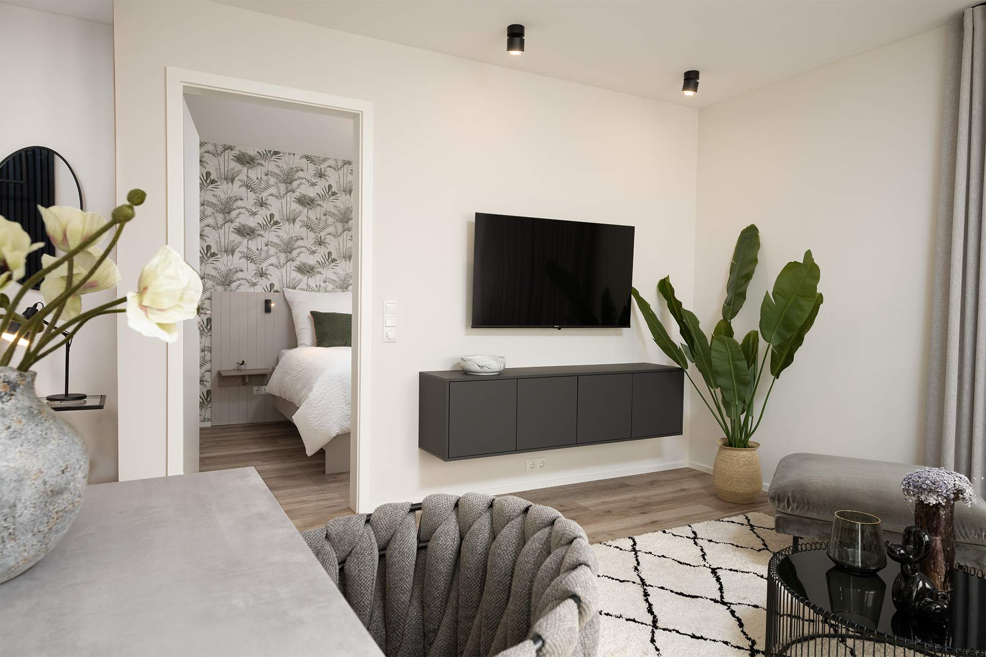 Mit rund 49 m² Fläche ist das Apartment großzügiger geschnitten und hat eine Terrasse. Genau wie alle unsere Apartments verfügt auch dieses Apartment über ein gemütliches Doppelbett sowie ein separates Bad mit Dusche. Die Einrichtung ist gehoben, stilvoll und modern konzipiert. Für Ihren erholsamen Aufenthalt in Aachen-Würselen und Entspannung am Abend ist es mit einem Flatscreen-TV in Wohn und Schlafzimmer ausgerüstet. Gerne können Sie das Apartment auch zu zweit beziehen. Natürlich steht Ihnen kostenlos Wlan zur Verfügung. Auf dem hauseigenen Parkplatz finden Sie eine Wallbox um Ihr Auto für den Trip in die Umgebung vorzubereiten. Waschmaschine und Trockner stehen im einem separatem Raum mit Münzspeicher bereit.